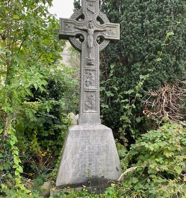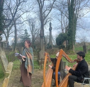 In 2021 during a lockdown reprieve, our creator Deirdre, noticed that the gates of Friar's Bush Cemetery in Belfast were still not open. After a little investigating and many rabbit holes of research, an all-consuming lockdown and post-lockdown project started that would involve chatting or consulting with dozens of community members about what should/could be done with this seriously neglected, overgrown significant ancient Belfast graveyard, for the good of the citizens. Meetings, phone-calls and email communications, too many to count, were exchanged and arranged with a few hundred community representatives including Stranmillis local residents, Somerton Road Catholic hierarchy and a trail of artisans,architects and artistes and not forgetting local Belfast historians/guides and archaeologists, including the late Dr Eamon Phoenix, Dr Eileen Murphy, Ruairí Ó Baoill and Tom Hartley and others like John Bradbury and Brendan Muldoon who contributed enormously to the exciting unfolding and ever-evolving flagship project conceived by Dr Deirdre Nic an tSionnaigh Fox: Friar's Bush Reimagined.