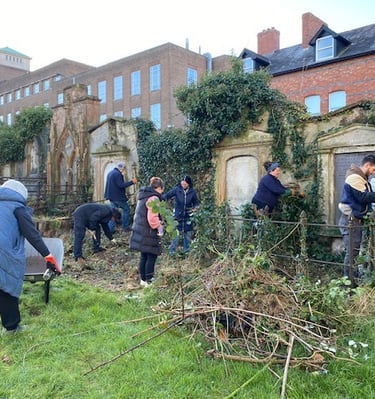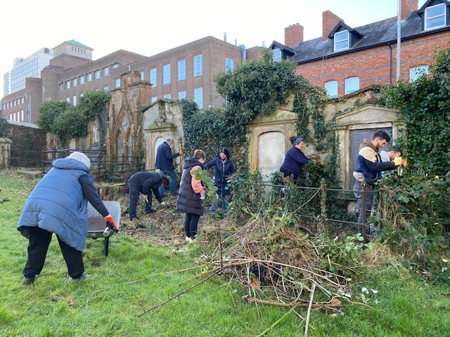 We meet once or twice weekly in a warm welcoming group. To join our volunteering team email us on mail@cairdenacille.org today. We champion biodiversity in the graveyard e.g. retaining vegetation tackled/tidied up within the green space, conserving the unique ecosystem naturally established there. (This means all the little bugs, snails, singed insects and pollinators all stay within the old graveyard walls! We have plans for large composting and mulching to facilitate our biodiversity and a pollinating programme for increased bees and other insects to help tackle climate change pressures. We are open and diverse, welcoming all religions and none, all races, abilities and LGBTQ into our inclusive community